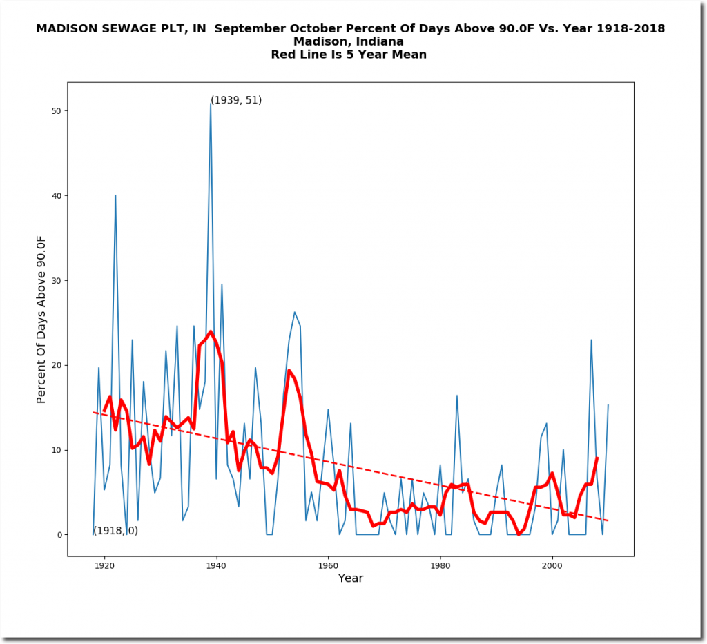 From September 1 to October 9, 1939 – Madison, Indiana afternoons averaged 95 degrees, had thirty-one days over 90 degrees, and eleven days over 100 degrees. On October 8, 1939 is was 100 degrees in Indiana. Imagine the global warming hysteria is this happened now.