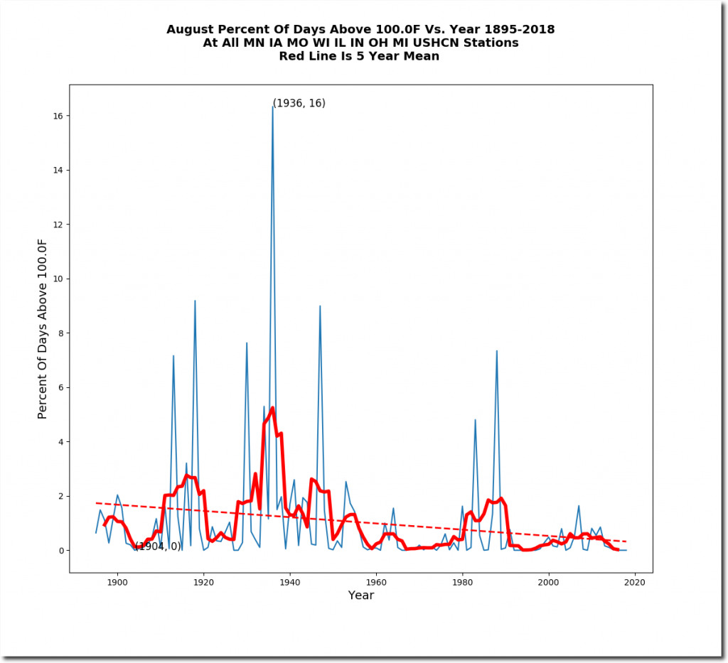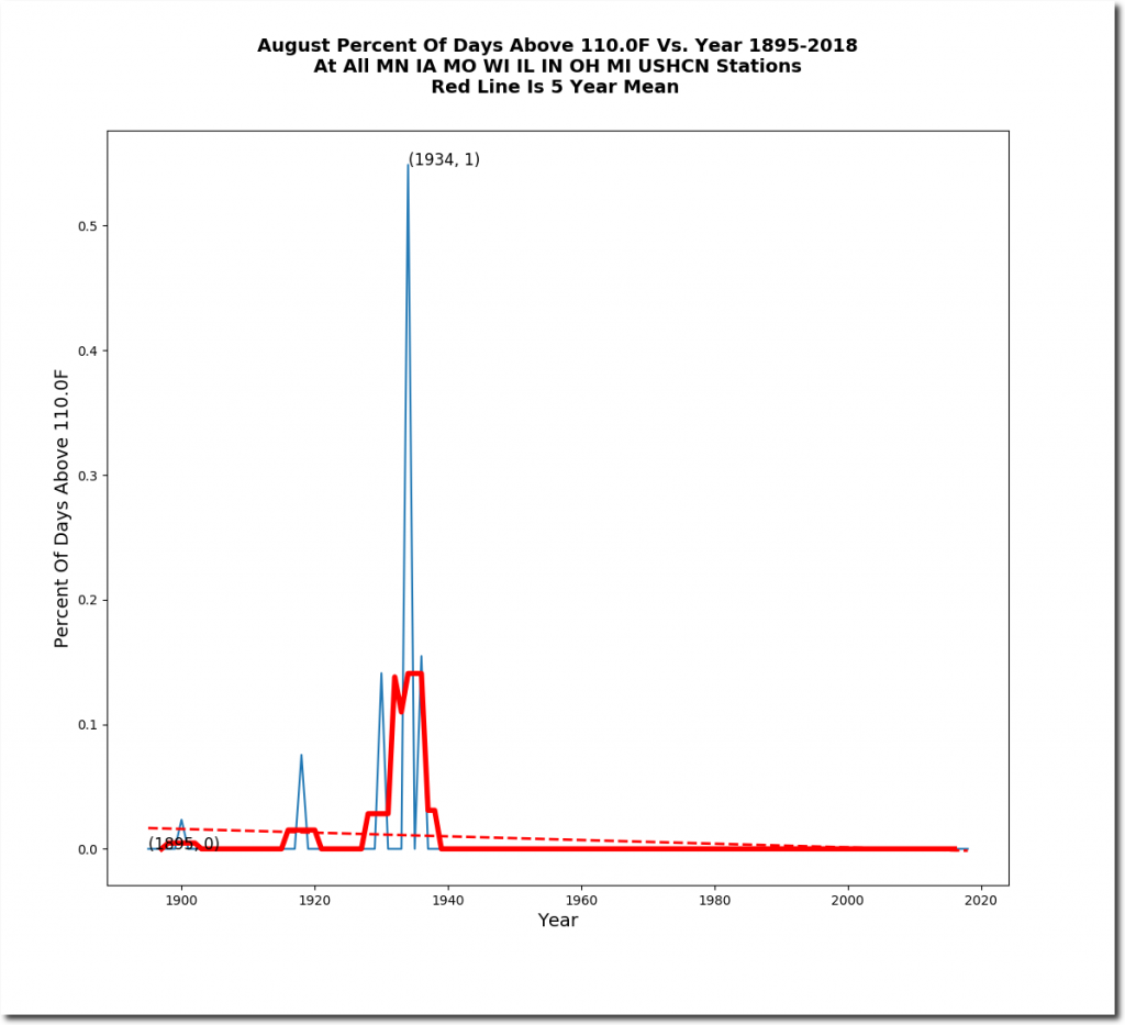 August days over 110 degrees in the Midwest were common prior to 80 years ago. but have only happened once since then – in 1980.