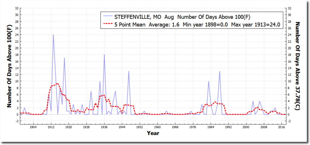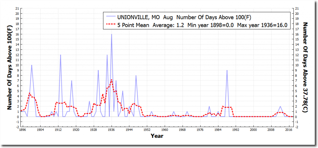 One hundred degree days were common during August in Missouri prior to 60 years ago, but they rarely happen any more.