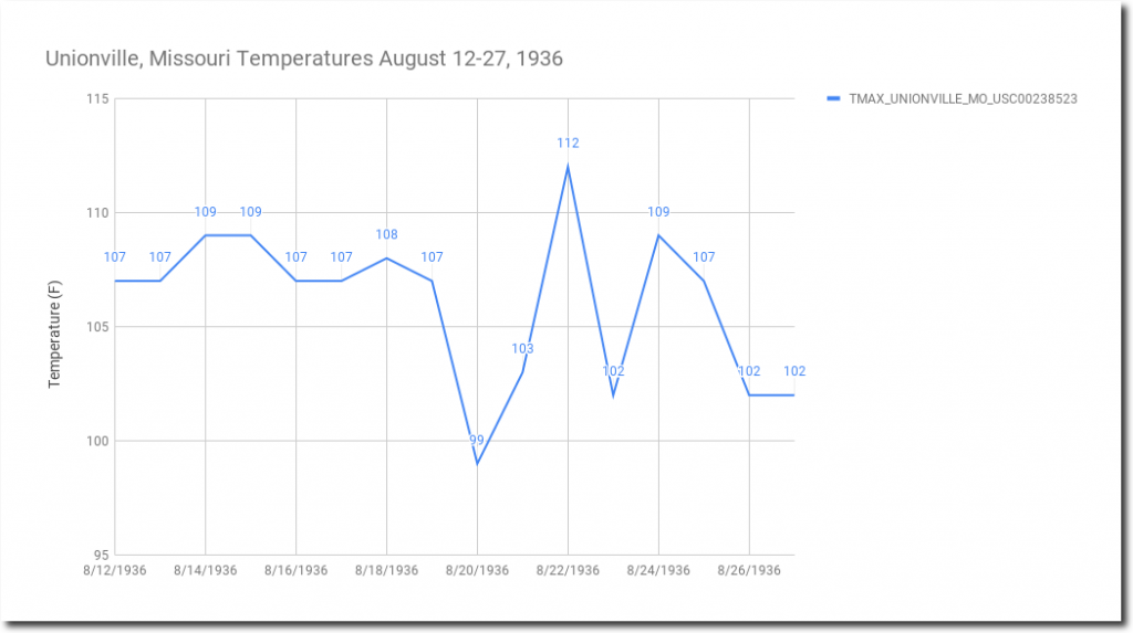 From August 12-27, 1936, afternoon temperatures at Lexington, Missouri averaged 106 degrees, peaked at 110 degrees, and were never below 100 degrees.