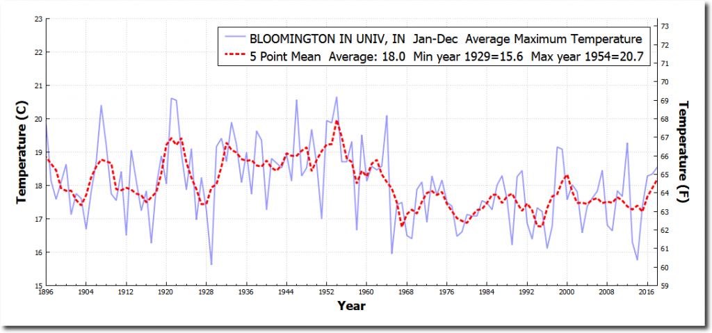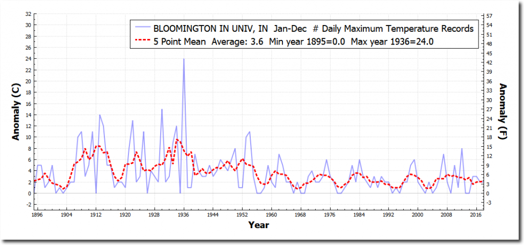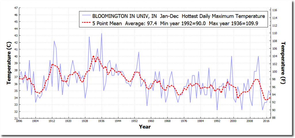 The weather station at Indiana University has been keeping very good temperature records since the lat 19th century. Hot weather occurs there much less frequently than it did prior to 60 years ago.