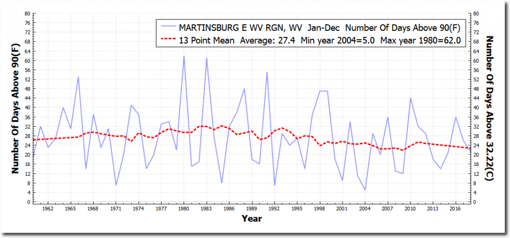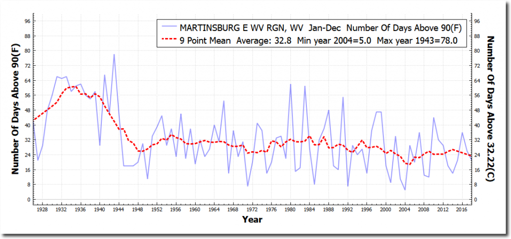 This is completely fraudulent. According to the official NOAA temperature record, the number of 90 degree days at Martinsburg has decreased from 25 to 23 days per year since 1960.