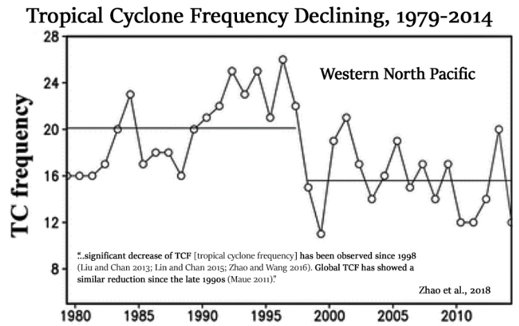 The story is much the same in the North Western Pacific, where the following chart shows us cyclone frequency has been much lower over the past two decades compared to the two decades prior.