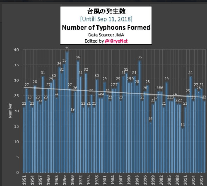 And using the data from the Japanese Meteorological Agency (JMA), skeptic blogger Kirye also tweeted that the number of typhoons being formed has declined modestly over the years: