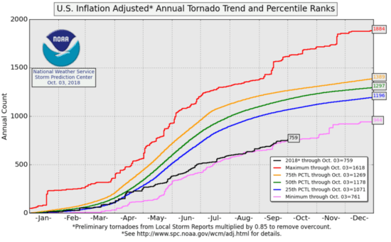 As of October 3, the cumulative total for 2018 is 759; the previous lowest number of tornadoes for this date was 761. The SPC has records extending back 65 years.