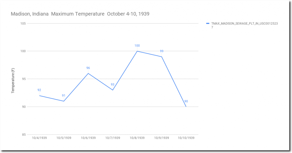 During the week of October 4-10, 1939 – Madison, Indiana was over 90 degrees every day, and reached 100 degrees on October 8, 1939. Madison afternoon temperatures average about ten degrees cooler on October 6 now, than they did during the 1930s.