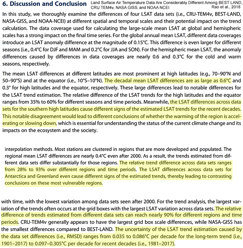 “The uncertainty of the LSAT [land surface air temperature] trend estimation caused by the data set differences (i.e., RMSD) ranges from 0.035 to 0.086°C per decade for the long-term trend (i.e., 1901–2017) to 0.097–0.305°C per decade for recent decades (i.e., 1981–2017).”