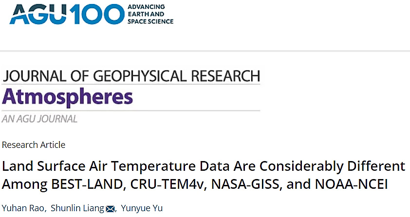“Several groups routinely produce gridded land surface air temperature (LSAT) data sets using station measurements to assess the status and impact of climate change. The Intergovernmental Panel on Climate Change Fifth Assessment Report suggests that estimated global and hemispheric mean LSAT trends of different data sets are consistent. However, less attention has been paid to the intercomparison at local/regional scales, which is important for local/regional studies. In this study we comprehensively compare four data sets at different spatial and temporal scales, including Berkley Earth Surface Temperature land surface air temperature data set (BEST‐LAND), Climate Research Unit Temperature Data Set version 4 (CRU‐TEM4v), National Aeronautics and Space Administration Goddard Institute for Space Studies data (NASA‐GISS), and data provided by National Oceanic and Atmospheric Administration National Center for Environmental Information (NOAA‐NCEI). The mean LSAT [land surface air temperature] anomalies are remarkably different because of the data coverage differences, with the magnitude nearly 0.4°C for the global and Northern Hemisphere and 0.6°C for the Southern Hemisphere.”