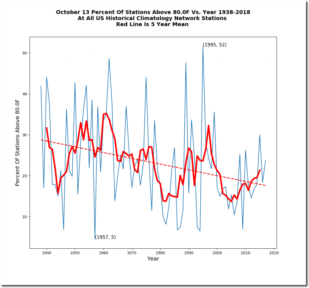 October 13 used to be a warm day in the US, but over the past 80 years, October 13 afternoon temperatures have dropped sharply. On this date in 1940, Danville, Illinois was 98 degrees. Yesterday’s maximum at Danville was 41 degrees.