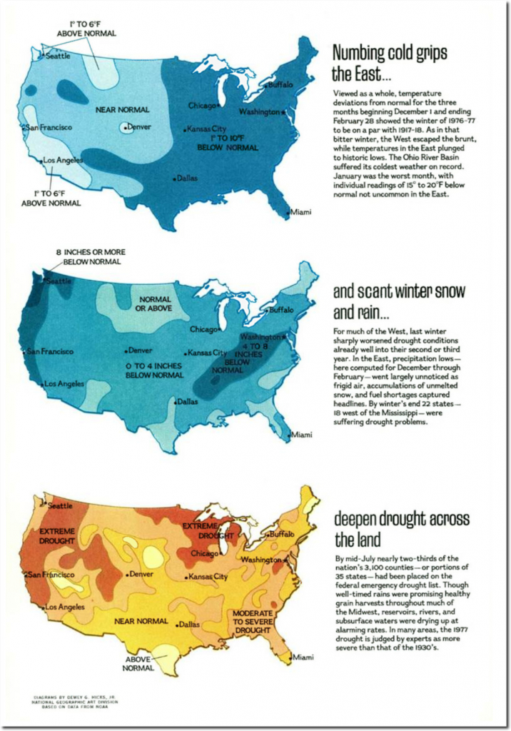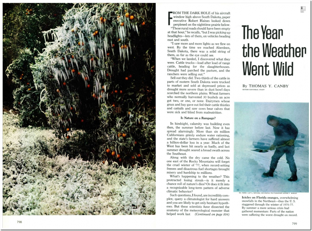 During the winter of 1976-1977, global cooling and large amounts of Arctic sea ice produced this jet stream pattern. It caused very cold temperatures in the Eastern US, and warmth, drought and fire to the western US.