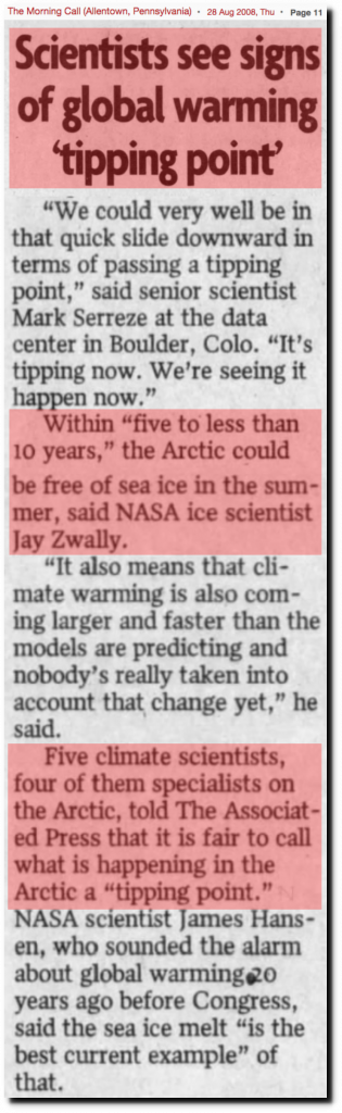 NASA’s leading climate prophet, James Hansen, said the entire Arctic would be free of ice between 2013 and 2018 – and that 2008 was the last chance to save the planet.