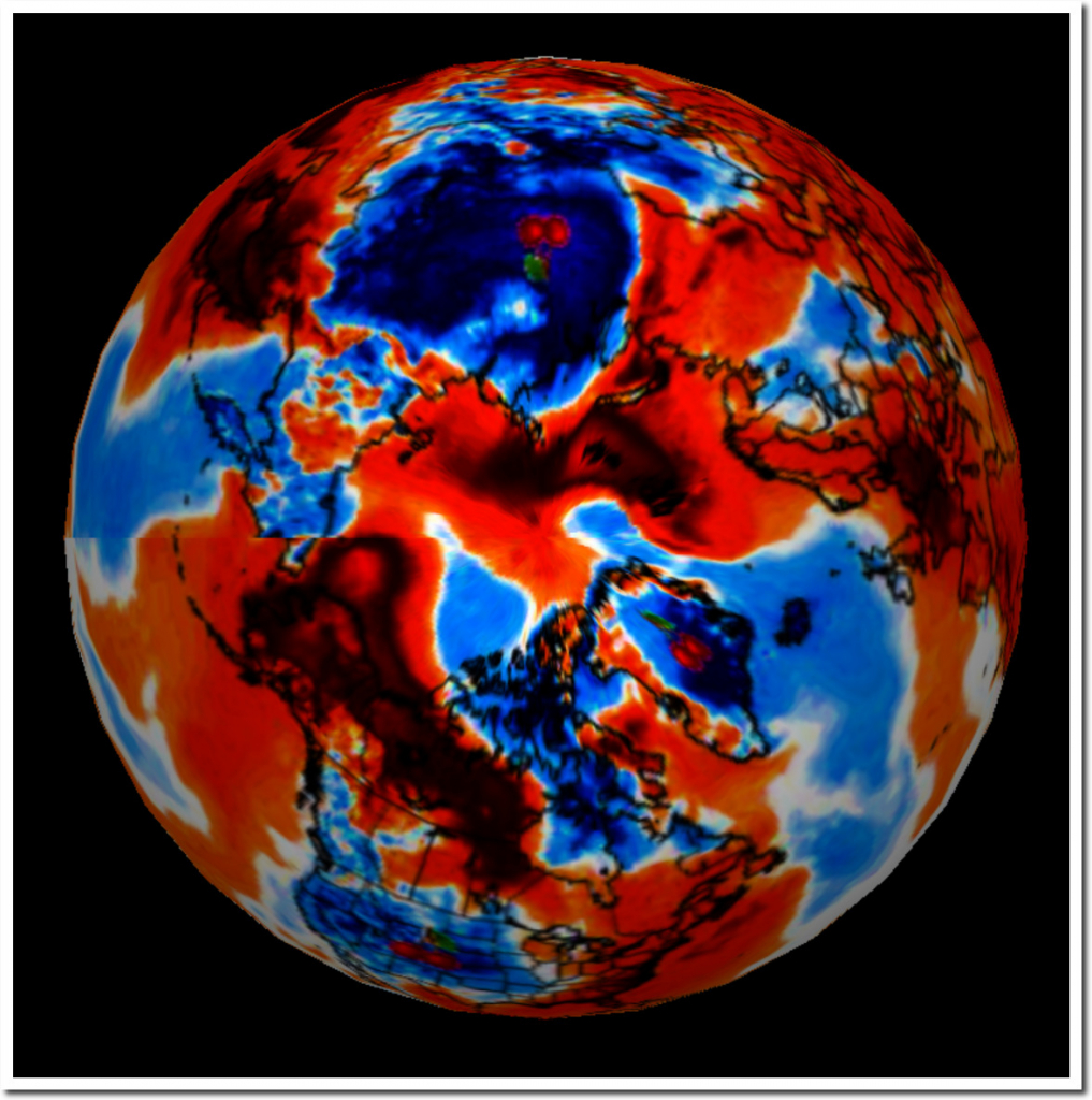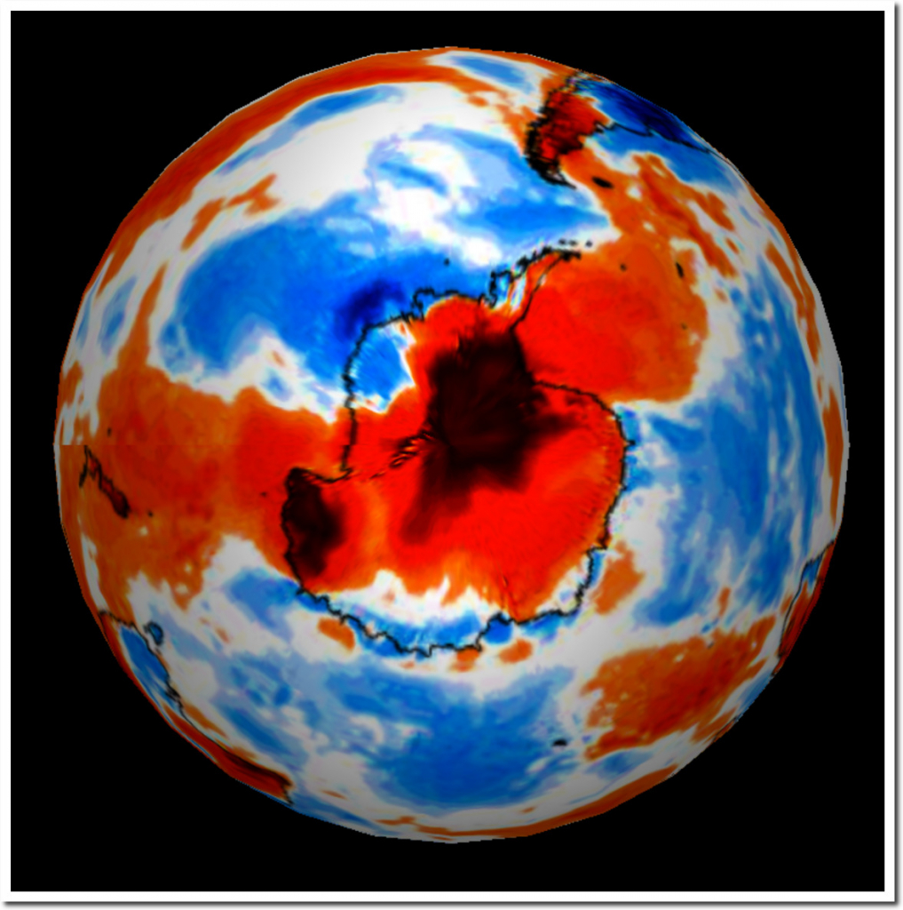A lot of climate alarmist trickery is based around the fact that humans don’t see blues as well as they do reds. So I increased the color saturation of his map, and projected it on to a sphere with equal area weighting. Now it becomes clear that there is a lot extremely cold air surrounding both poles. The jet stream is bringing cold air to the US, much of Canada, Russia, Greenland, Argentina and Brazil, and slightly warmer than normal air to the poles.