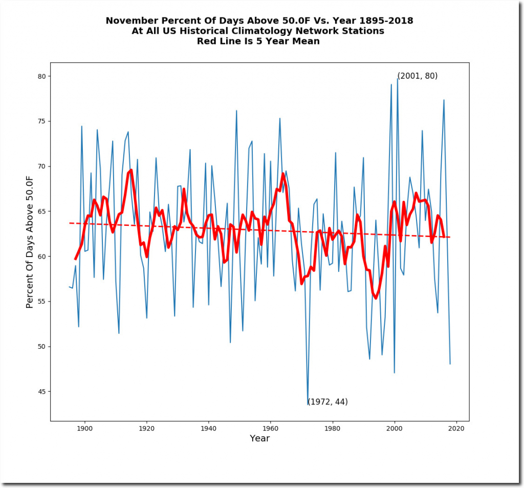November US afternoon temperatures were fourth coldest on record, and the percentage of days over 50 degrees was third lowest on record. November afternoon temperatures have been declining in the US since the 19th century.