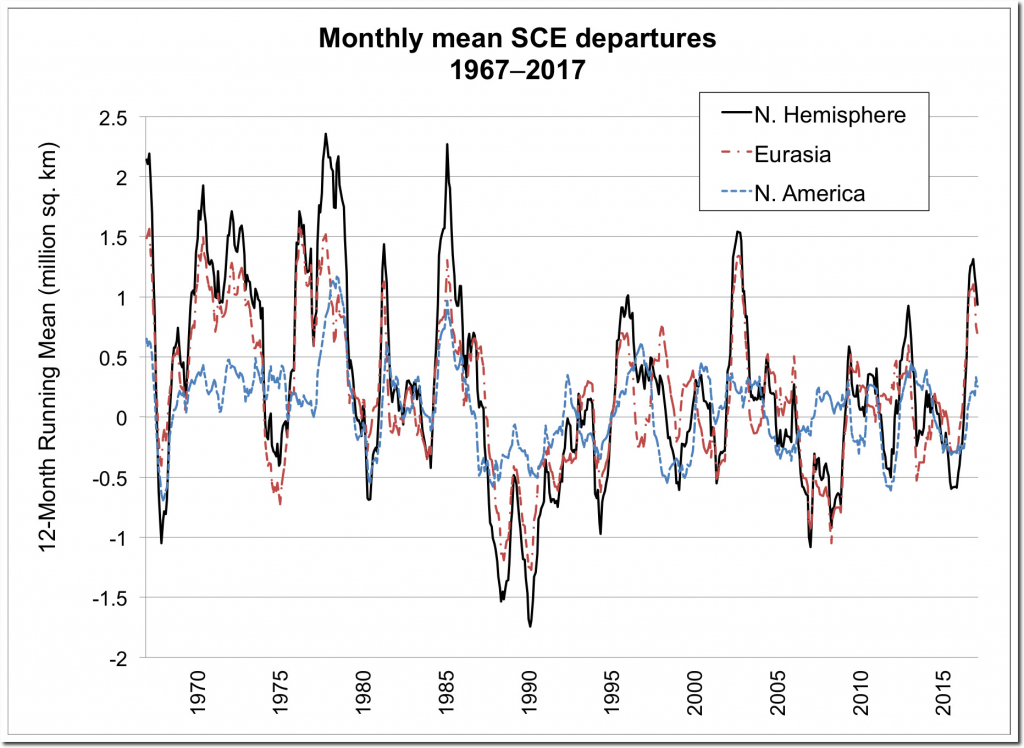 Snow extent has increased sharply since CO2 reached 350 PPM in 1988, and has been above normal for several years.