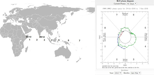 This figure [above] shows that on the 02-12-2018 the new MJO was just moving into phase 1 and that by the 09-12-2018 it was starting to progress into phase 3 [see the locations marked on the left of the diagram above].