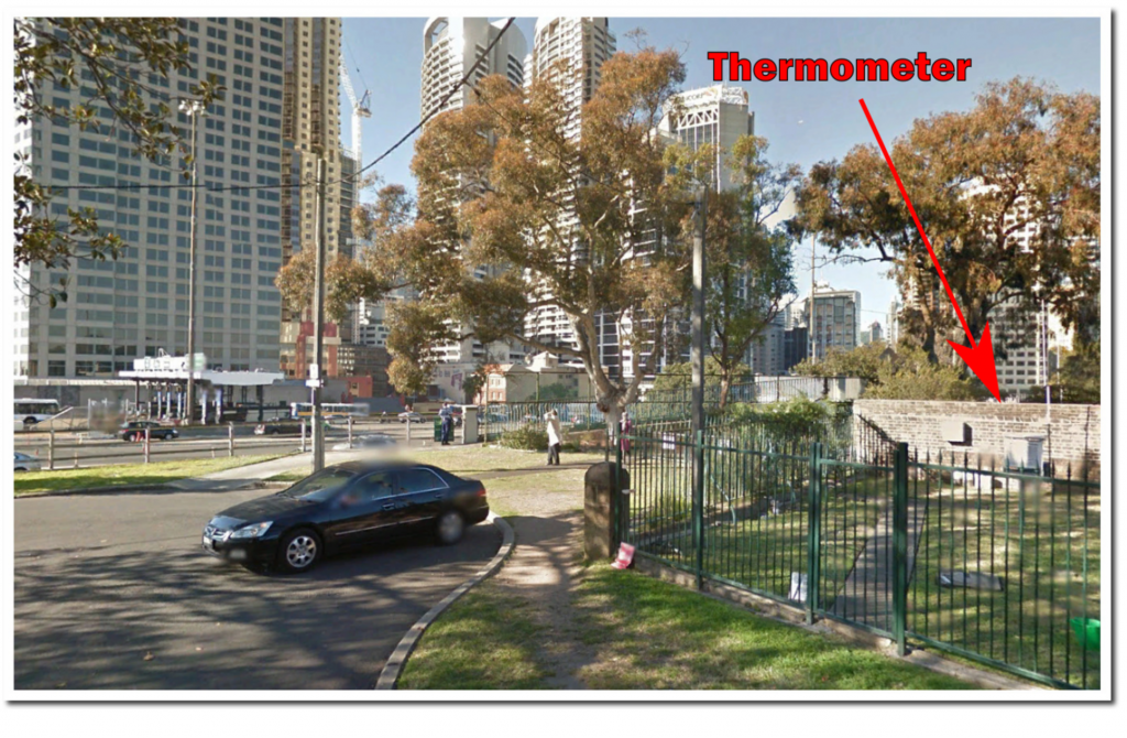 The official thermometer at Sydney is located immediately adjacent to 22 lanes of asphalt, and across the street from a glass building which reflects sunlight down on to the thermometer.