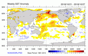 Starting the autumn, the BLOB was relatively weak. To illustrate, here is the sea surface temperature anomaly (difference from normal) for the end of October–as much as 2-3C warmer than normal! This was associated with an area of persistent high pressure over the northeast Pacific.