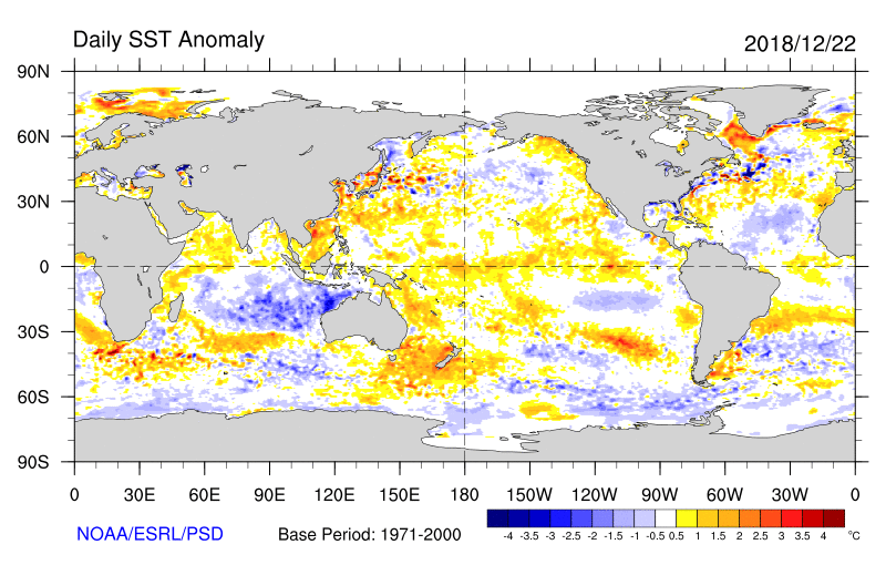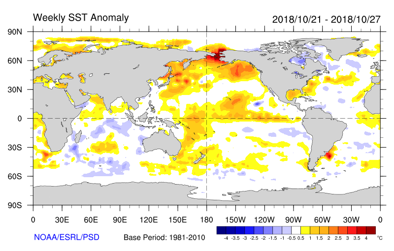 Starting the autumn, the BLOB was relatively weak. To illustrate, here is the sea surface temperature anomaly (difference from normal) for the end of October–as much as 2-3C warmer than normal! This was associated with an area of persistent high pressure over the northeast Pacific.