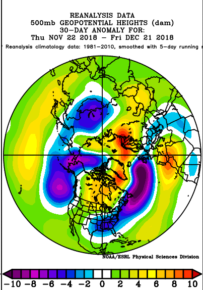 Here is the proof: the anomaly of the mid-tropospheric (500 hPa) heights from normal for the last 30 days. Blue and purple indicate lower than normal heights, which is associated with more and deeper low-pressure centers, which in turn cause strong winds. A big area of lower heights (or equivalently pressure) was found over the NE Pacific.
