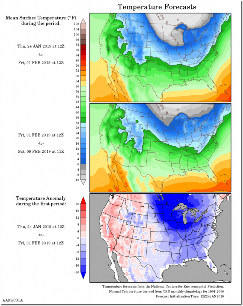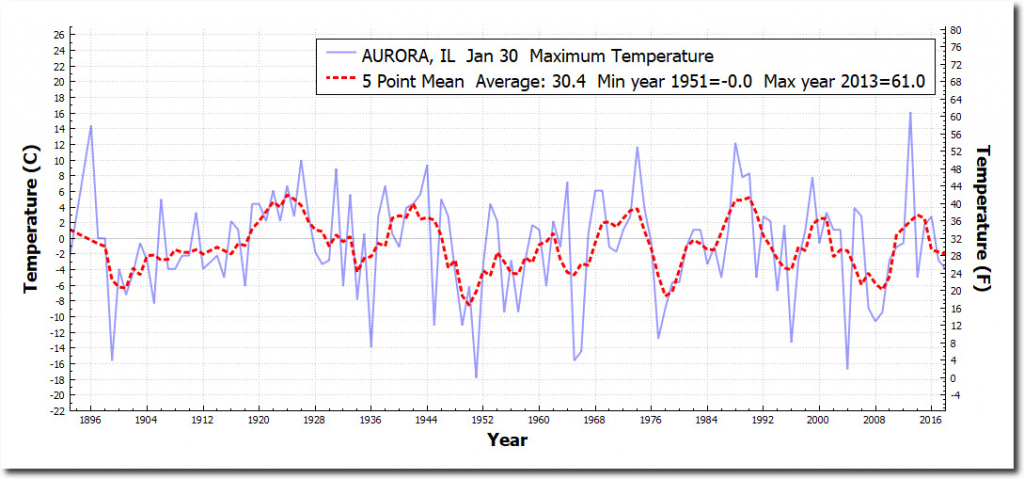 That super-hot air is coming south, and is forecast to obliterate the Aurora, Illinois record for January 30 afternoon cold – by eight degrees.