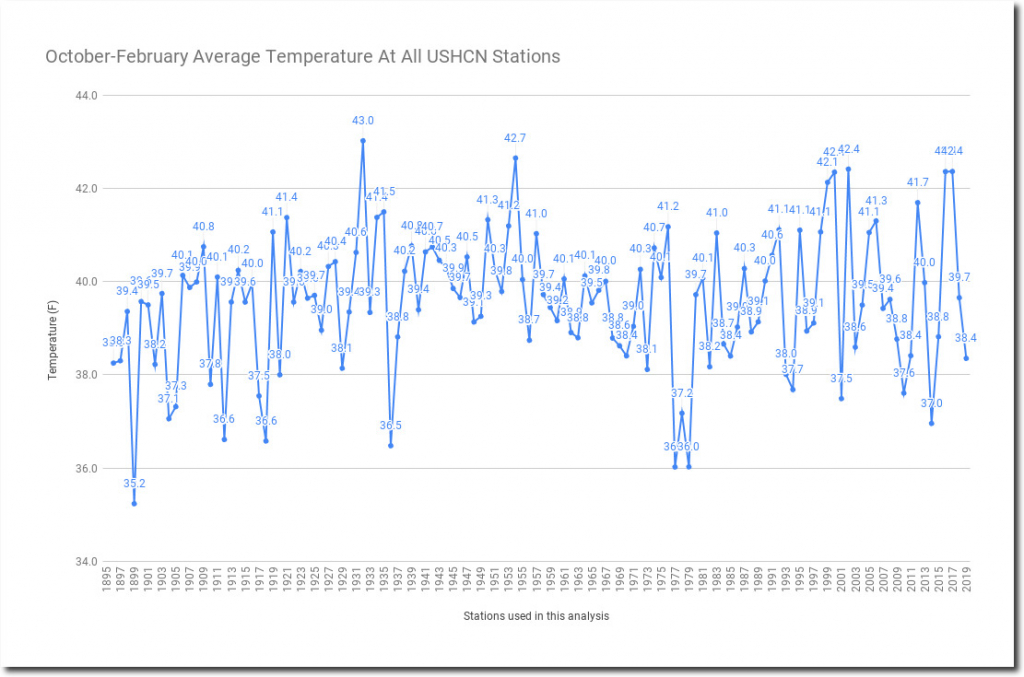 October to February averaged about 1.2F below normal in the US, and almost five degrees cooler than 1932.