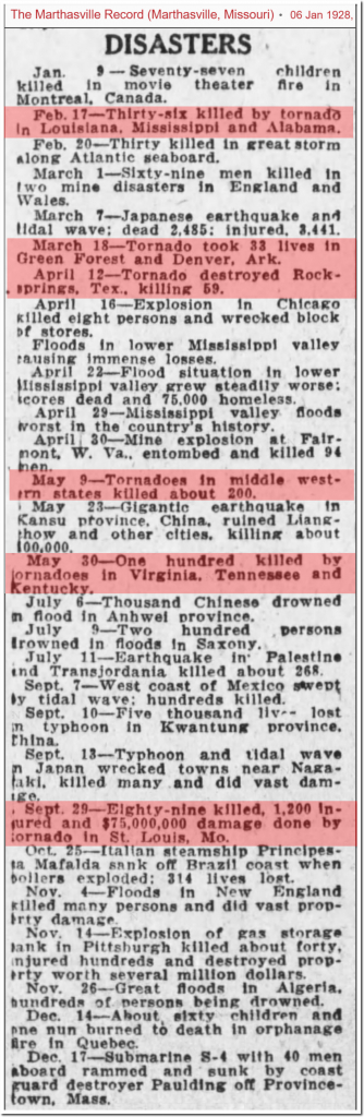 The Red Cross described 1927 as the worst year in history, with 111 disasters – including 29 tornadoes, 24 floods, 9 hurricanes and 23 fires.