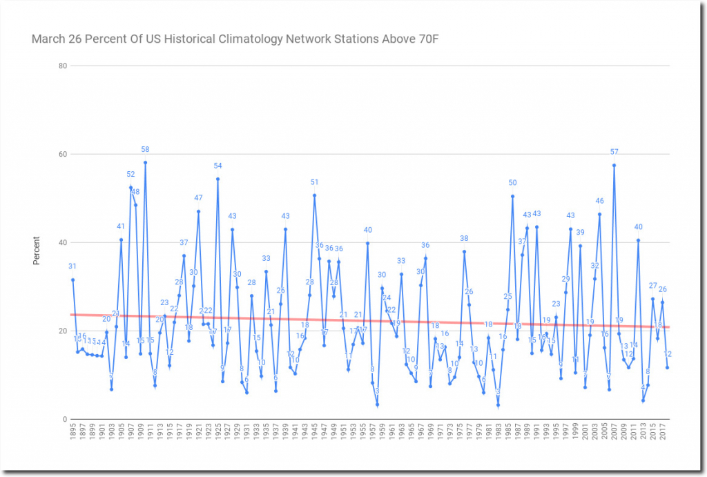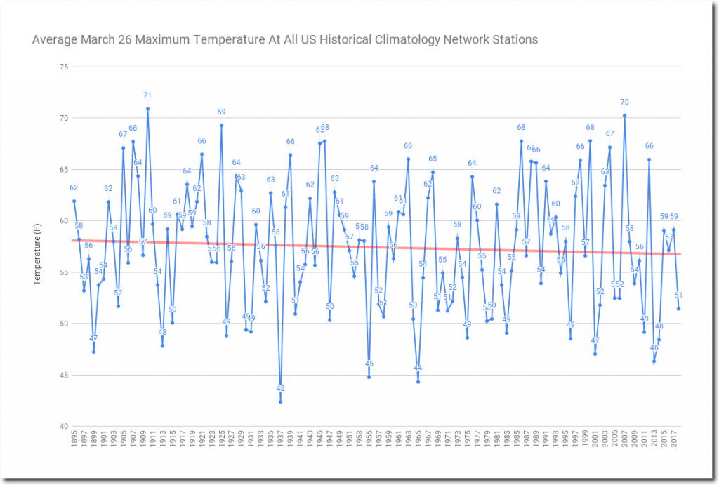 March 26 temperatures have been declining in the US since the 19th century, with 1910 the warmest, and the last six years all very cool.