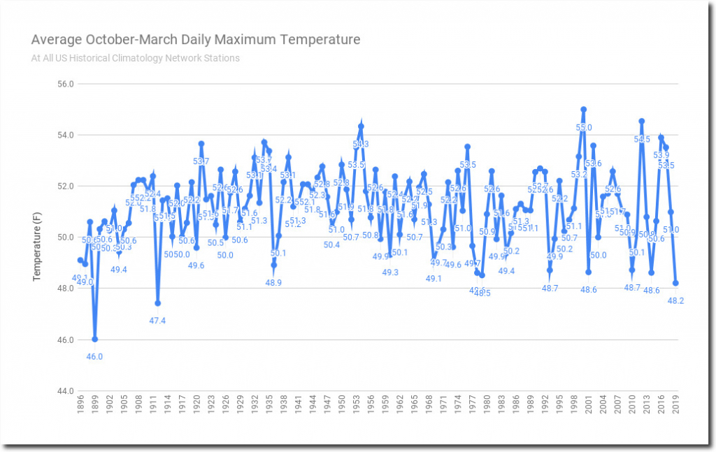 In my previous blog post, I reported that October-March afternoon temperatures were third coldest on record in the US. Bob Ward angrily responded with :