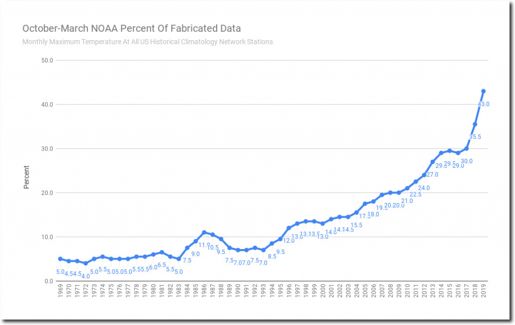 About 43% of the data NOAA used in the their adjusted calculation was fabricated by computer model, rather than record – the largest percentage of fake data on record. The fake data is marked with an “E” in the NOAA text files.
