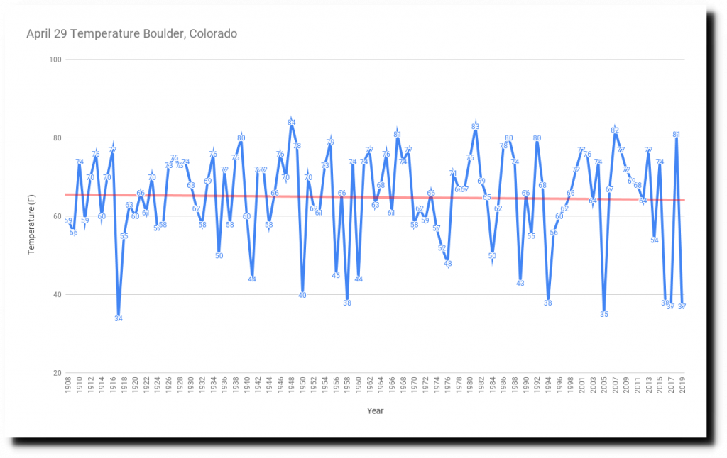 Yesterday afternoon’s peak temperature of 37 degrees in Boulder was the third time in the past four years with April 29 temperatures below 40 degrees.