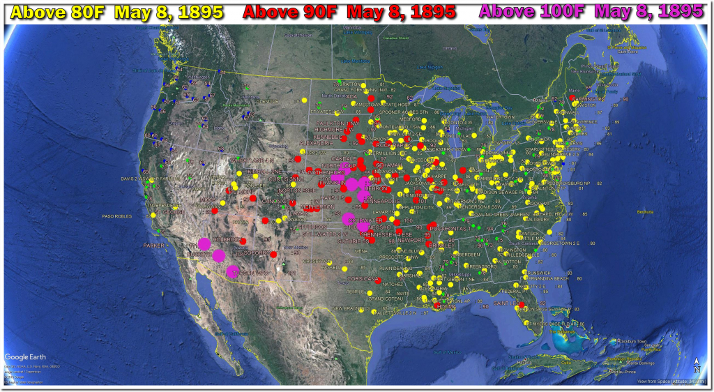 On this date in 1895, three quarters of the US was above 80F. Ninety degree temperatures were recorded in Minnesota, Maine and much of the Midwest. One hundred degree temperatures were reported in Nebraska, Kansas and Oklahoma, and Arizona was over 110F.