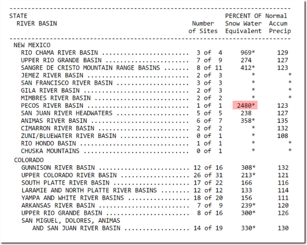 The Pecos River Basin in New Mexico, where I used to work as a wilderness ranger, has 2,480% of normal snowpack.