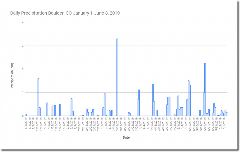 Meanwhile, my research assistants study the permanent drought in Boulder – where we have had rain or snow on 56 days so far this year, including 16 of the last 22 days.