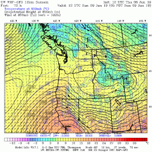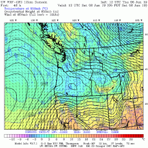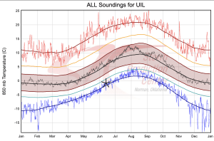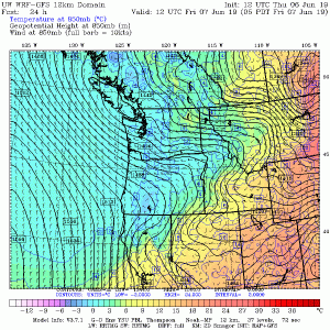 So why the unusual June Diablo winds this year?  Unusually cold temperatures.  Here is the climatological of temperatures at 850 hPa (again around 5000 ft) at Quillayute, on the Washington coast, versus time of the year.  The blue lines represent the record low temperatures for the date.  I put a marker on Friday’s value—pretty much tied the record low.  No wonder there was snow at the Paradise ranger station on Mt. Rainier on Friday and early Saturday!