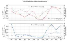 Why?  Because they are driven by cold, inland high pressure that is rare during the summer.     To show this, here is a figure from a paper on Diablo winds written by UW grad student Brandon McClung and myself (I have a NSF grant to study Diablo winds, by the way).   Diablo winds on the western side of the Sierra Nevada are rare in mid-June and infrequent around the Bay Area.  Big increase in fall as cool air moves inland.