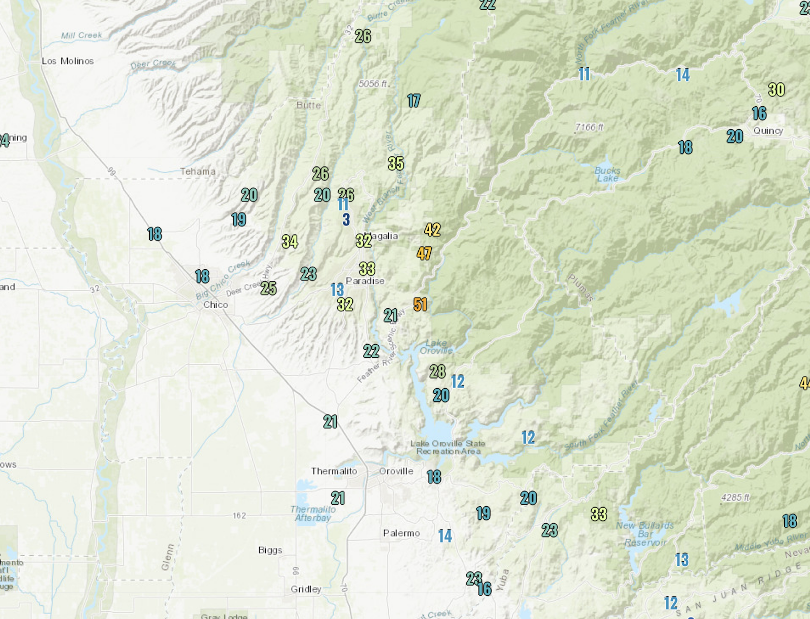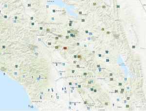 And over 45 mph gusts hit north and east of Paradise, CA, the location of the horrific Camp Fire last year.  With a poor power infrastructure, PG&E has to shut the power off to prevent their power lines from starting new fires.  One helpful thing this time of the year–vegetation is still relatively green, particularly after a very wet spring.