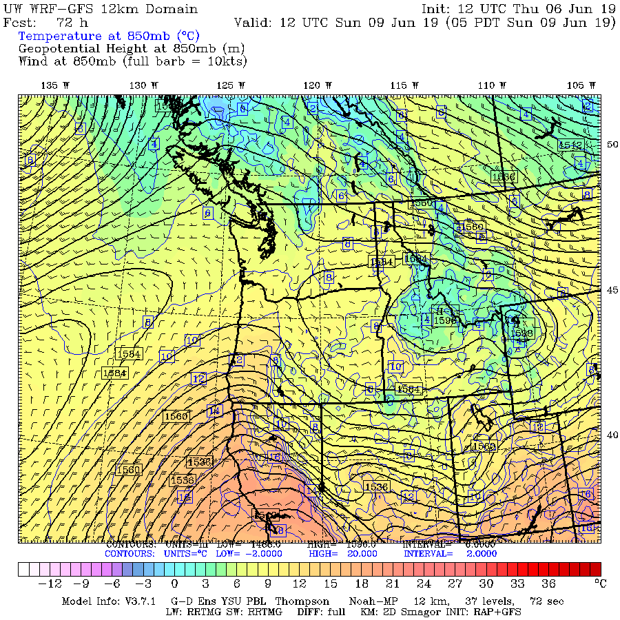 Below are a series of model forecasts during the period in question, including heights ( think pressure, solid lines), winds, and temperatures around 5000 ft (actually the 850 hPa pressure level).