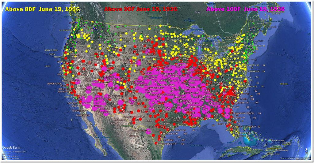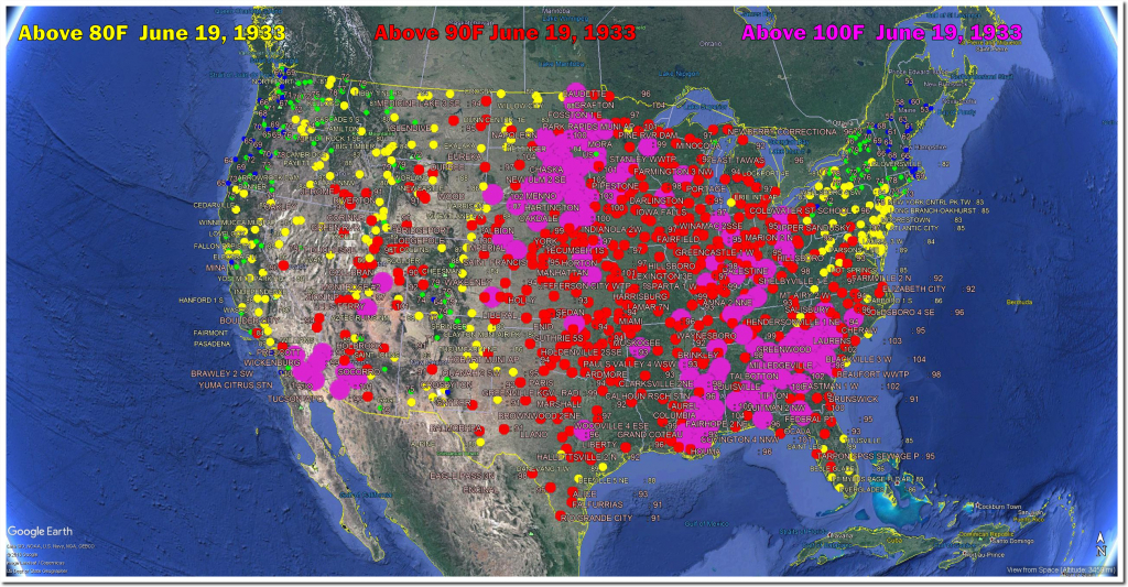 Prior to about 1940, June 19 used to frequently be a hot day in the US, but June 19 temperatures have been declining since the 19th century. One notable exception being 1988, during the week when James Hansen gave his testimony to Congress predicting increased summer heat.