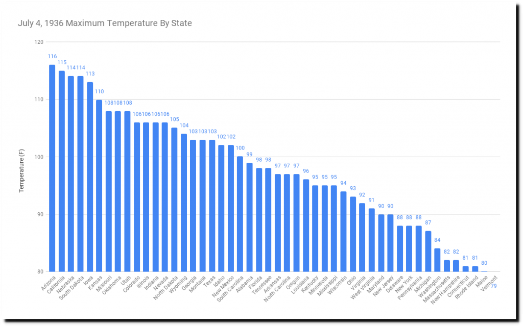 This graph shows the maximum temperature in each state on July 4th, 1911.