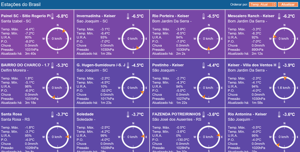 The thermometer reached -9.2°C at the station Epagri-Ciram in Urupema, the lowest temperature ever recorded. The previous record of -8.8°C was set on June 28, 2011.