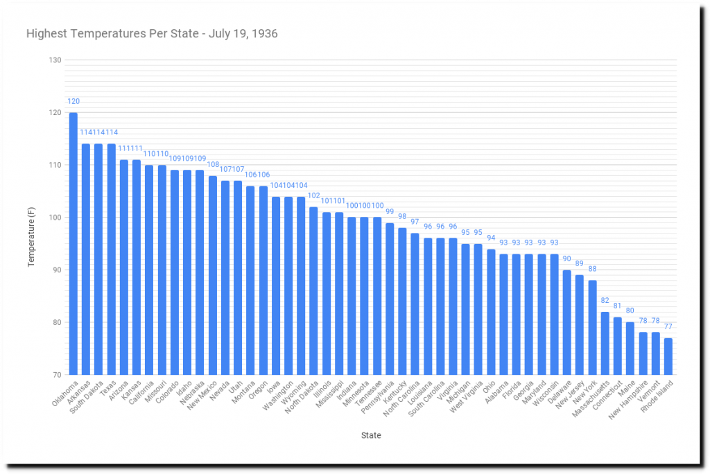 State Peak Temperature on July 19, 1936 ----- --- Oklahoma 120 Arkansas 114 South Dakota 114 Texas 114 Arizona 111 Kansas 111 California 110 Missouri 110 Colorado 109 Idaho 109 Nebraska 109 New Mexico 108 Nevada 107 Utah 107 Montana 106 Oregon 106 Iowa 104 Washington 104 Wyoming 104 North Dakota 102 Illinois 101 Mississippi 101 Indiana 100 Minnesota 100 Tennessee 100