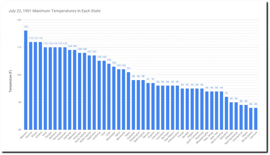 Missouri was 116F, Arizona 112F, Illinois 112F, Indiana 112F, Iowa 110F, Kansas 110F, Montana 110F, Tennessee 110F, Wisconsin 110F, Kentucky 109F, Nebraska 109F, Arkansas 108F, South Dakota 108F, North Dakota 107F, Oklahoma 107F, California 105F, Ohio 105F, Utah 104F, Mississippi 103F, Idaho 102F, Minnesota 102F and Texas 101F.