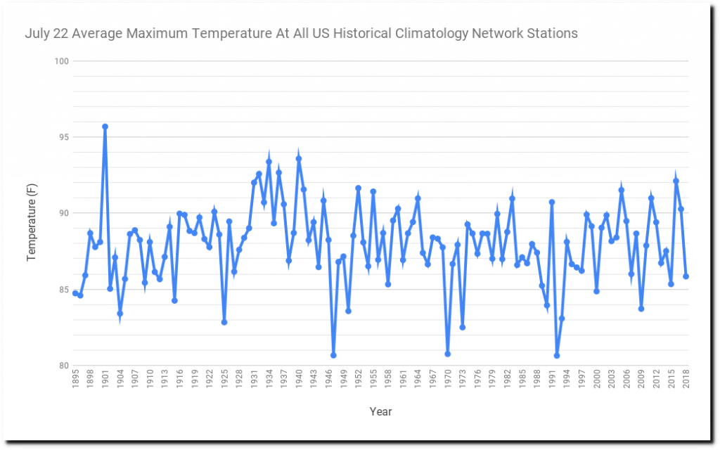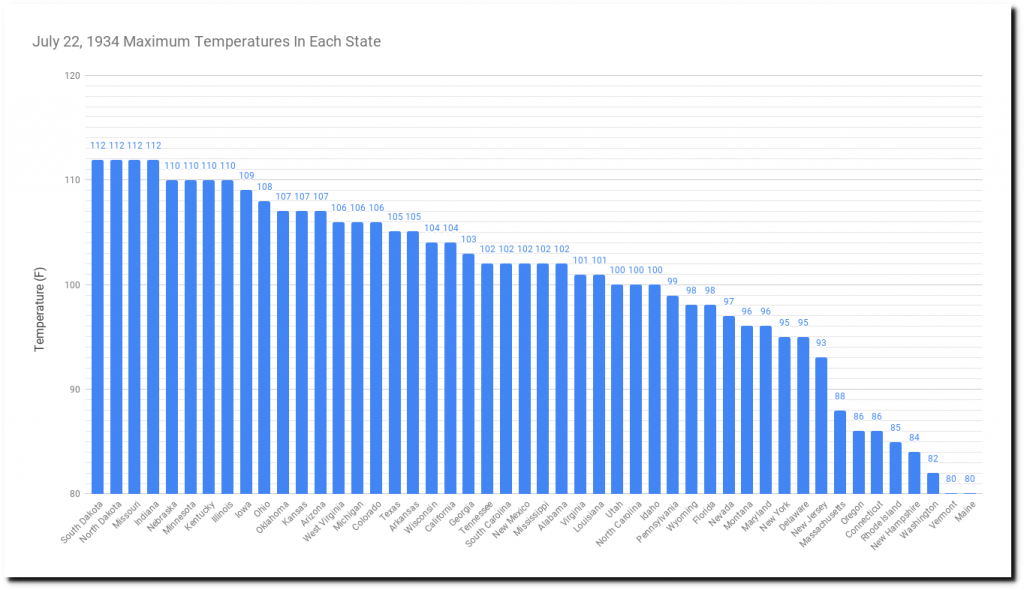 July 22, 1934 was even hotter in the eastern half of the US. Thirty-one states were over 100 degrees, and eight states were over 110 degrees.