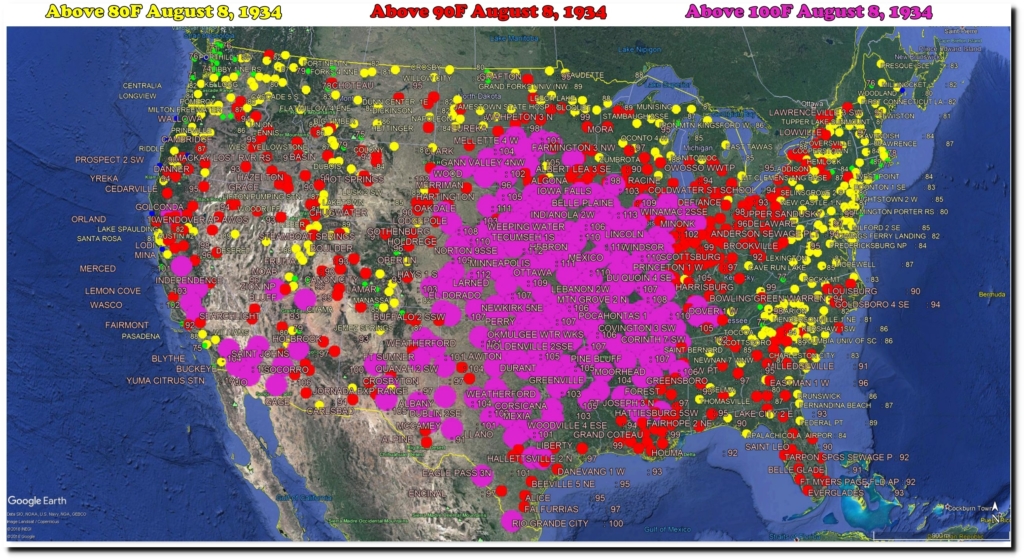 USHCN Temperatures over 110 degrees on August 8, 1934.