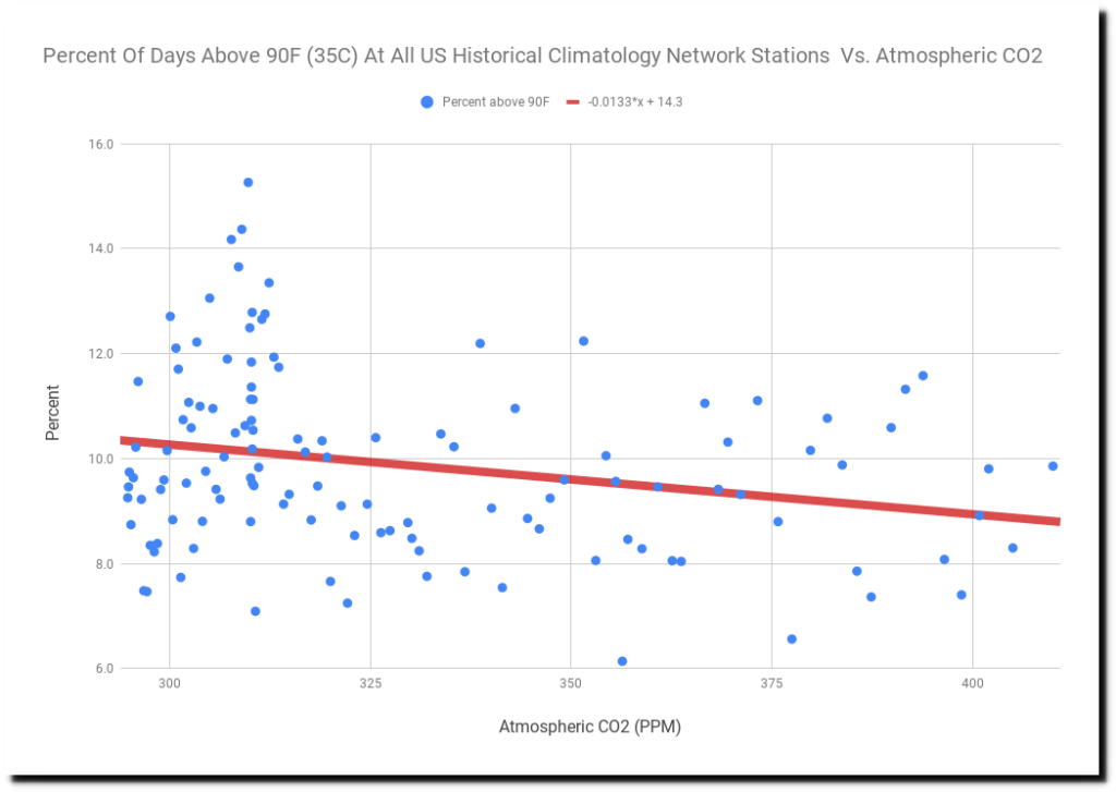 So there is no excuse for for them cherry-picking a start date of 1960 for US stations, failing to point out that the frequency of hot days has declined sharply in the US as CO2 has increased, and not mentioning that their projections of increasing hot days has no scientific basis.