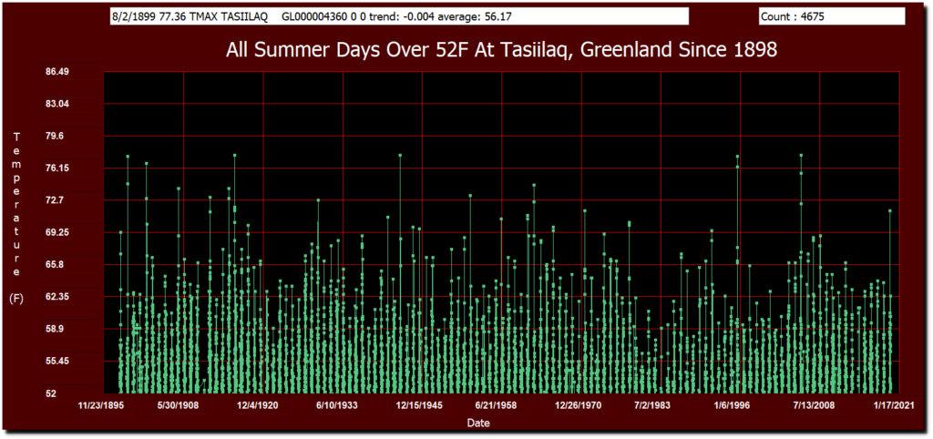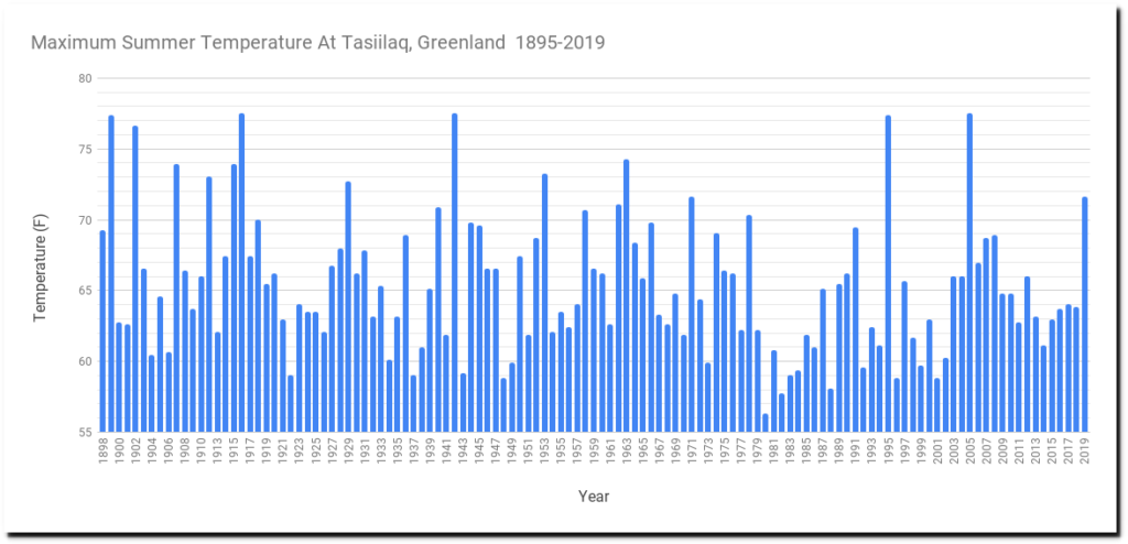 Summer maximum temperatures at Tasiilaq are about the same as they were prior to the cold period from 1960-2000.