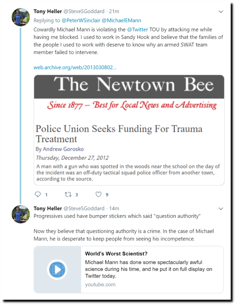 Following my latest expose showing Michael Mann’s incompetence,  he continues his Twitter rampage trying to get people not to listen to me.