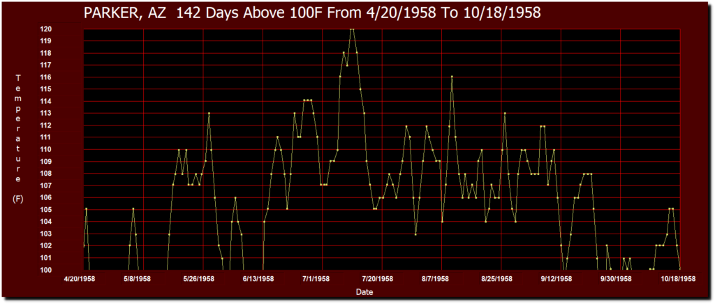 The longest stretch of 100 degree days was 142 from April 20 to October 18, 1958 at Parker.