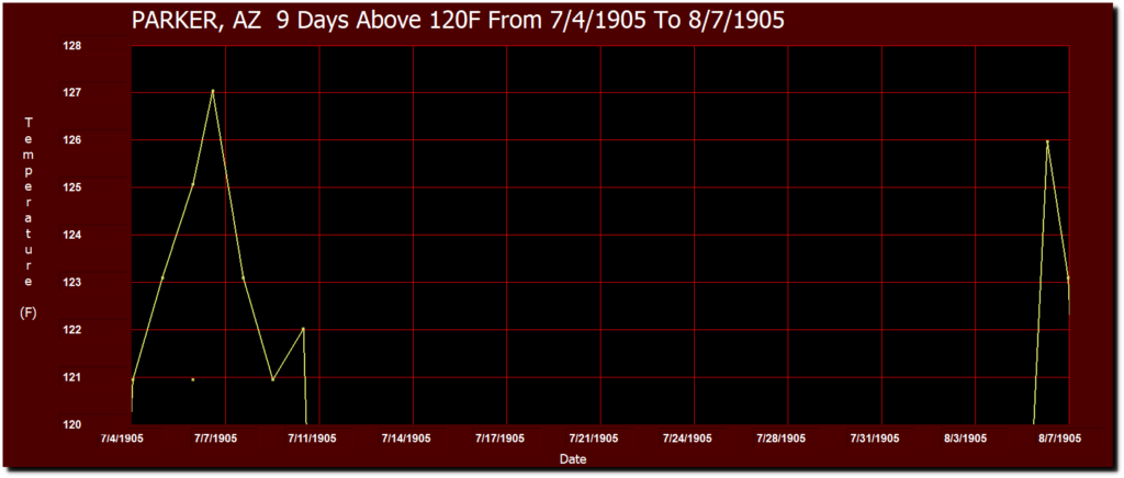 The longest stretch of 120 degree days was nine from July 4 to August 7, 1905 at Parker