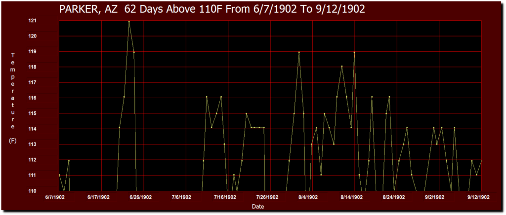 The longest stretch of 110 degree days was 62 at Parker from June 7 to September 12, 1902